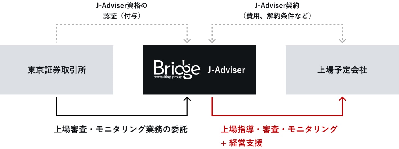 J-Adviserは、東京証券取引所や証券会社に代わって上場準備のサポートや上場審査、上場後のモニタリング等の業務を一貫して行います。